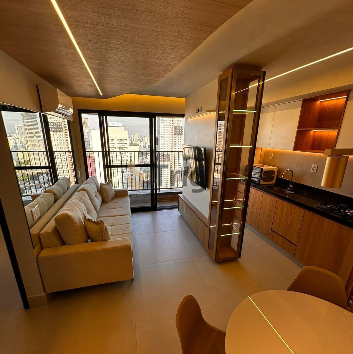 Diferenciais: 100% mobiliado e decorado · suíte com cama de casal e ar-condicionado · segundo quarto montado (ideal para hóspedes ou home office) · sala com sofá premium e iluminação em LED · cozinha completa com geladeira inox, fogão, coifa e micro-ondas · marcenaria planejada em todos os ambientes · banheiros com box e espelhos · andar alto · vaga privativa