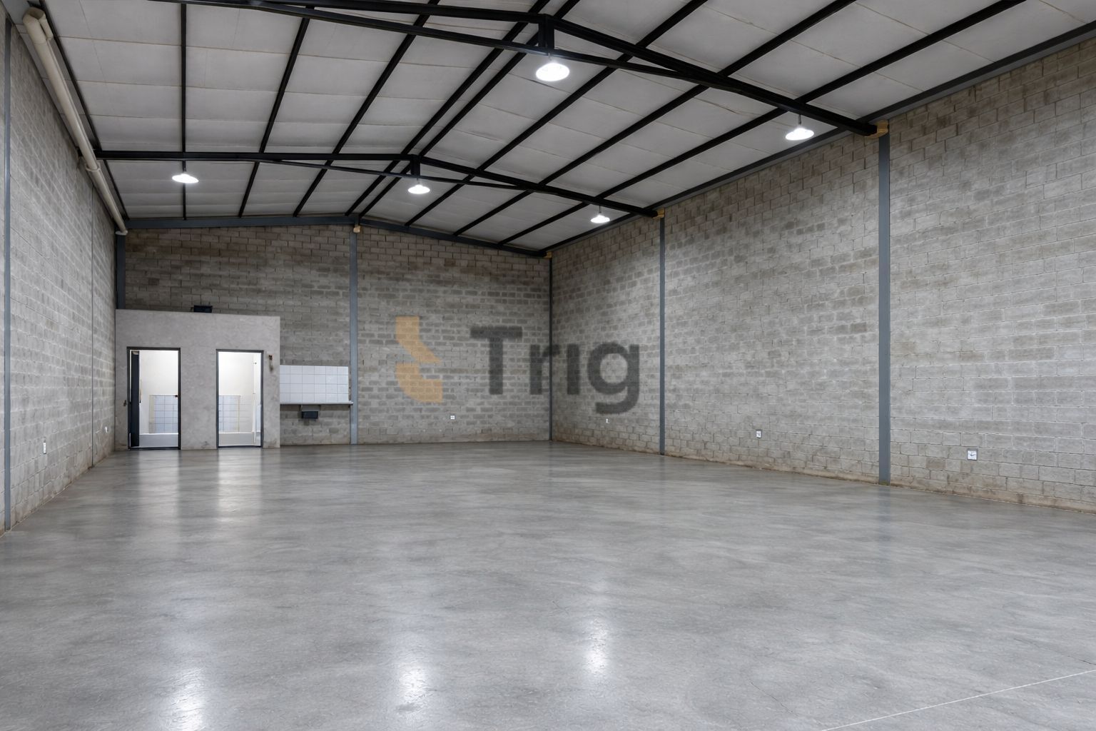 Possui 360 m² de área total e 285 m² de área construída, além de 2 banheiros e 1 pia de apoio. O acesso é facilitado por 2 portas de aço automatizadas e 1 porta lateral menor para entrada de serviço.